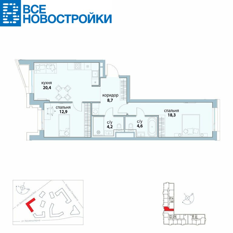 Продается 2-комн. квартира в ЖК «Символ» на 15-м этаже. Общая площадь лота составляет 69.10 кв. м.