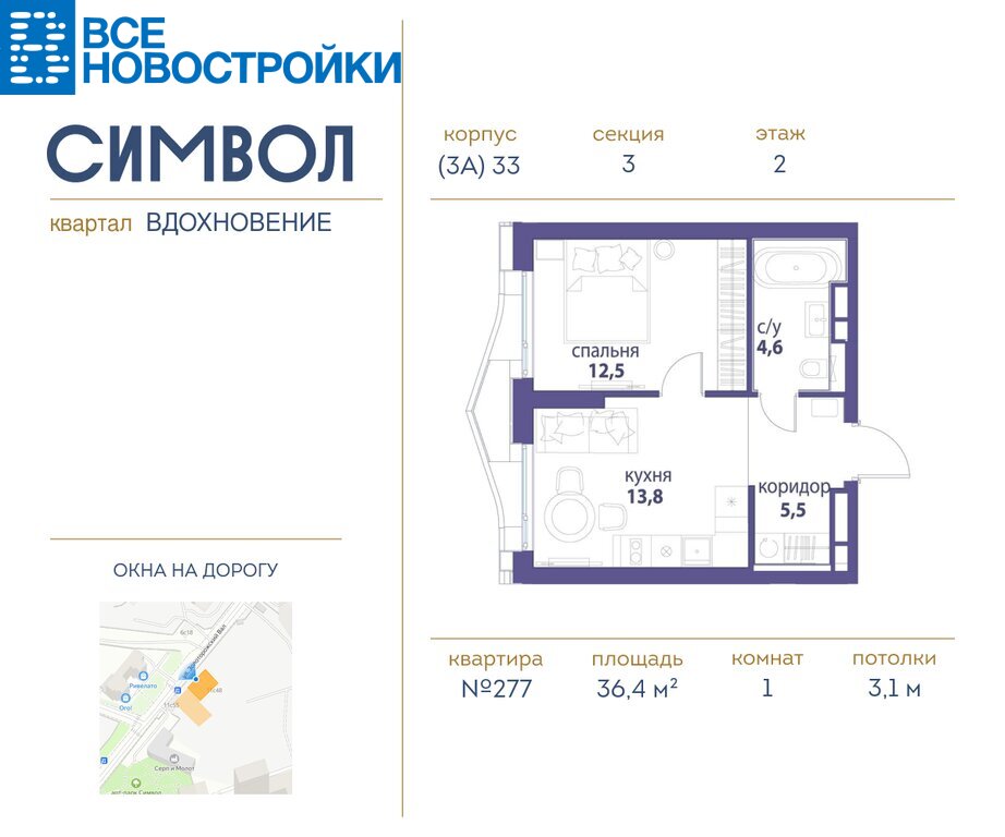 Продается 1-комн. квартира в ЖК «Символ» на 2-м этаже. Общая площадь лота составляет 36.40 кв. м, из которых 12.50 кв. м отведено под гостиную и 13.80 кв. м отведено под кухонную зону. 1 совмещенный санузел.