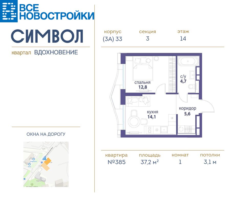 Продается 1-комн. квартира в ЖК «Символ» на 14-м этаже. Общая площадь лота составляет 37.20 кв. м, из которых 12.80 кв. м отведено под гостиную и 14.10 кв. м отведено под кухонную зону. 1 совмещенный санузел.