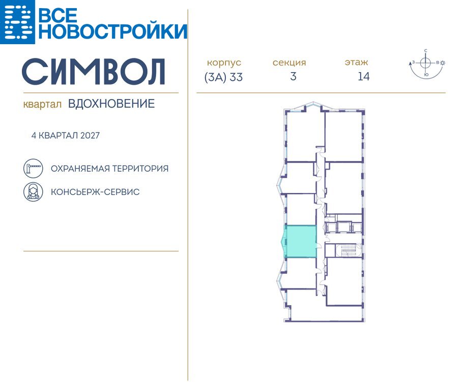 Квартира расположена в квартале Вдохновение, в корпусе 33 (секция 3). В каждом подъезде запроектировано 5 квартир на этаж, есть пассажирский и грузовой лифты.