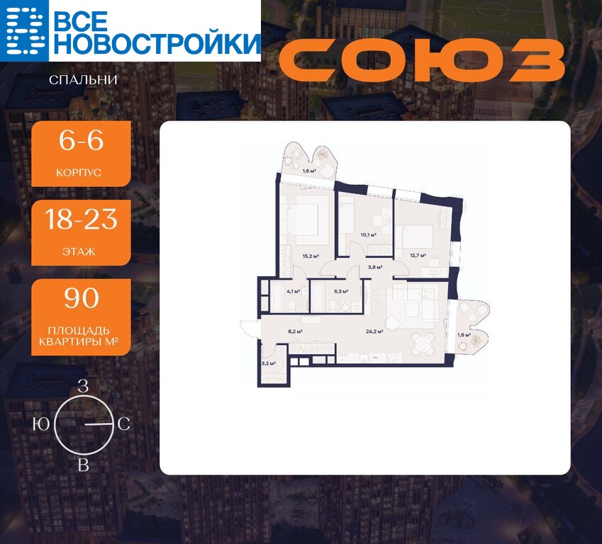 Продаётся 3-комнатная квартира площадью 90 м² на 18 этаже в Жилом Комплексе "Союз".