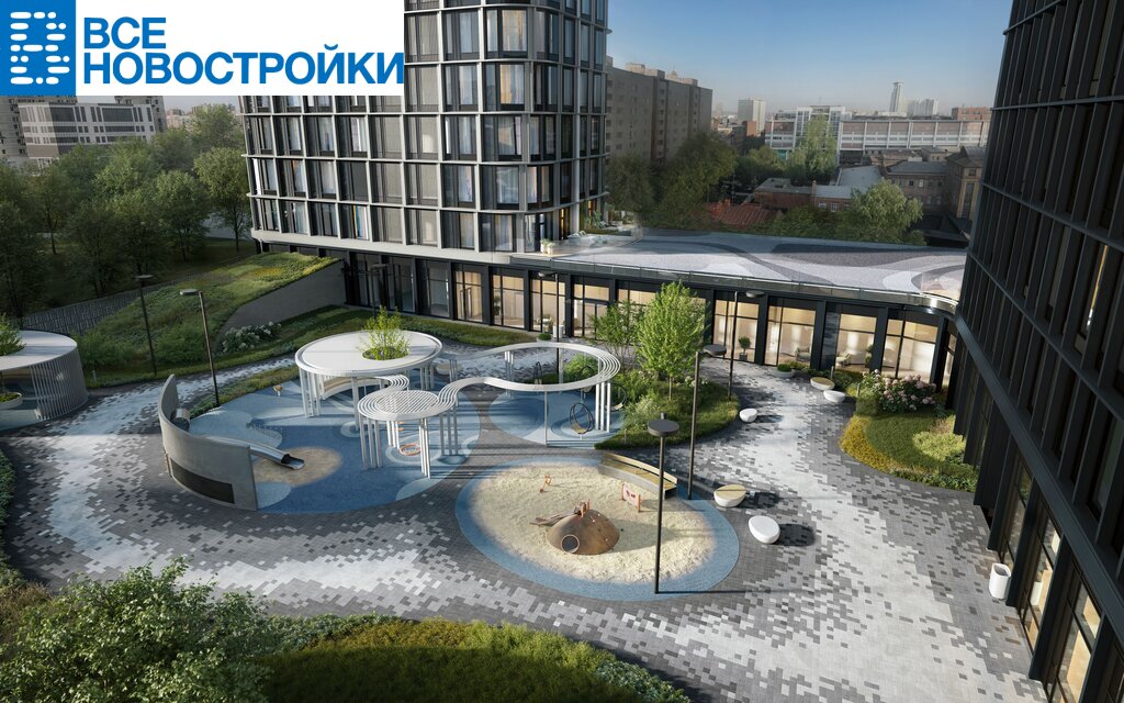 Во внутреннем приватном дворе будет создано пространство в бионическом стиле с лаунж-зонами, подвесными качелями, детскими плейхабами для разных возрастов, площадками для спорта и отдыха в окружении зелени.