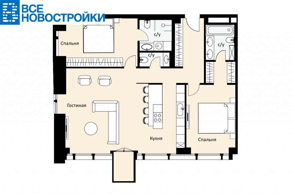Планировка: кухня-гостиная, 2 спальни с гардеробными и с\у, построчная.