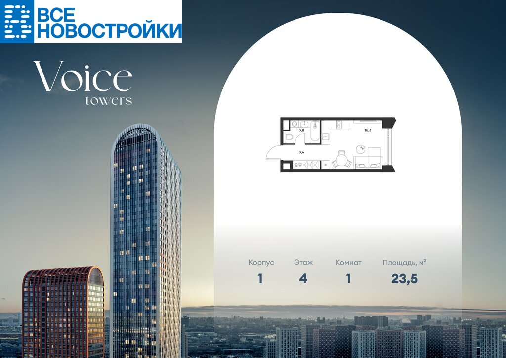 Продается уютная студия площадью 23,5 кв.м на 4 этаже жилого комплекса бизнес-класса Voice Towers от 3S Group. Общая площадь: 23,5 кв.м., жилая: 12,9 кв.м., площадь кухни-гостиной: 16,4 кв.м., высота потолков: 3,12 м., санузел совмещенный.
