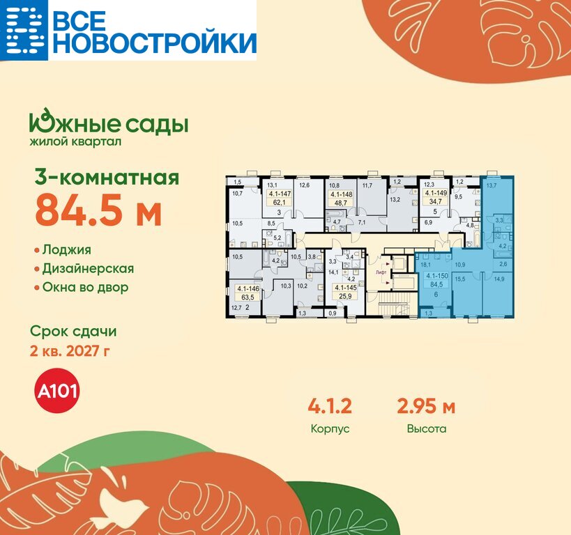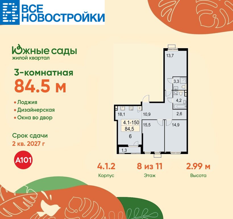 Продается трехкомнатная квартира № 180 в новостройке ЖК «Южные Сады» по адресу Москва, ЮЗАО, Южное Бутово, ул. Бартеневская, д. 16. Общая площадь квартиры – 84.50 кв. м., этаж 8 из 11, секция 2. Тип проекта, по которому построен дом – монолит, компания-застройщик – ООО «А101». Стоимость квартиры – 19174954 Р. Срок сдачи – 2 квартал 2027.