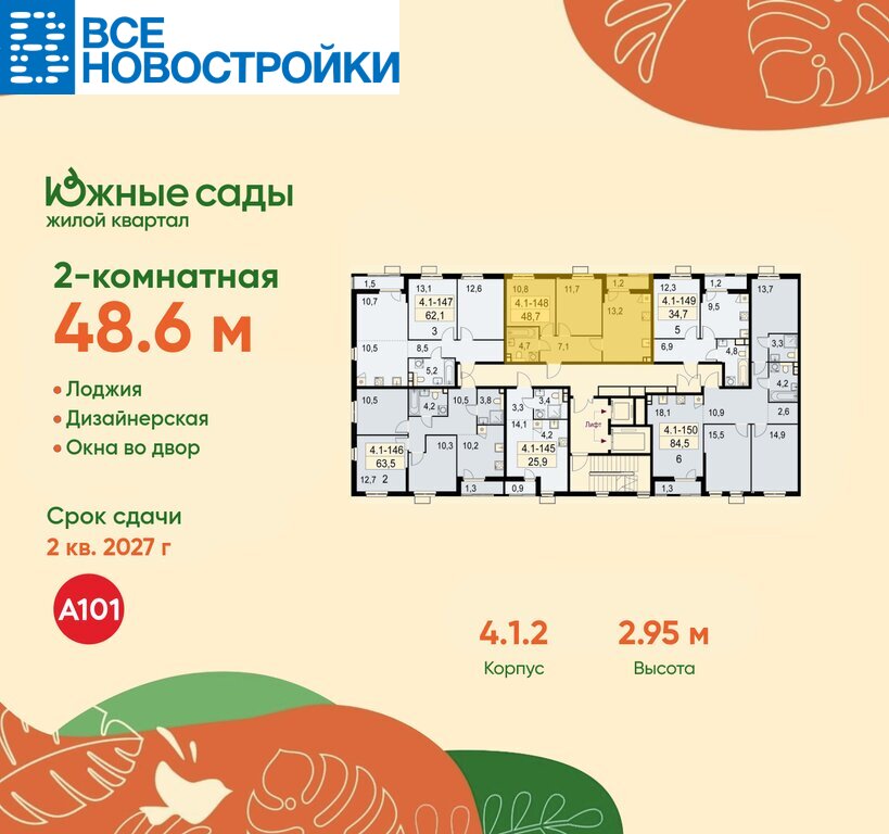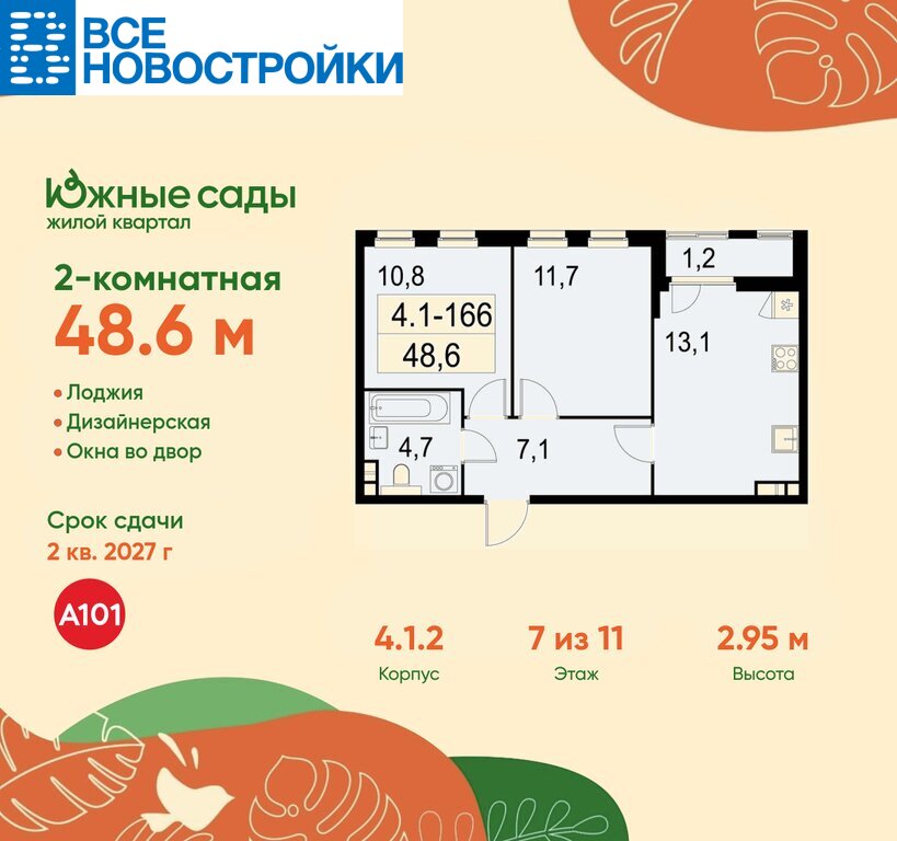 Продается двухкомнатная квартира № 172 в новостройке ЖК «Южные Сады» по адресу Москва, ЮЗАО, Южное Бутово, ул. Бартеневская, д. 16. Общая площадь квартиры – 48.60 кв. м., этаж 7 из 11, секция 2. Тип проекта, по которому построен дом – монолит, компания-застройщик – ООО «А101». Стоимость квартиры – 14625490 Р. Срок сдачи – 2 квартал 2027.