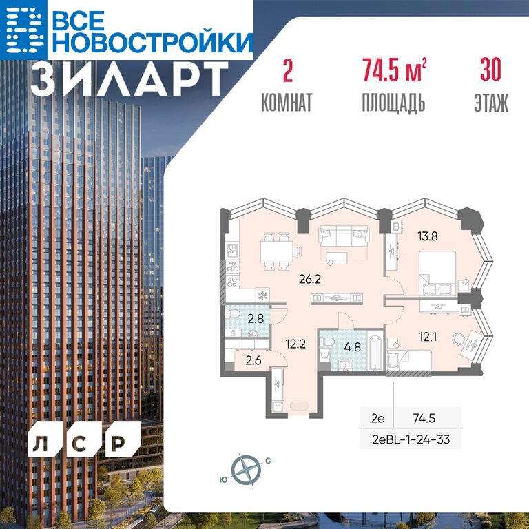 Продаётся 2-комнатная квартира в доме ЗИЛАРТ SPARK общей площадью 74.5 кв. метров на 30 этаже.