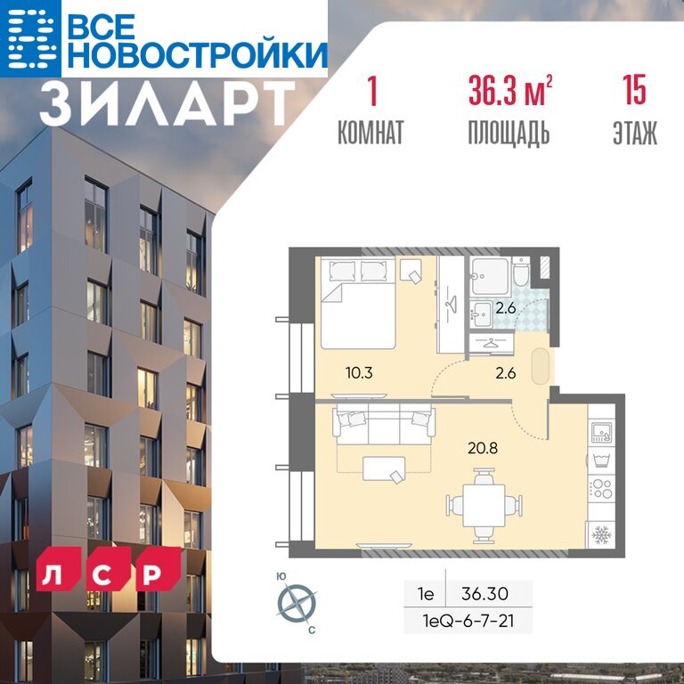 Продаётся 1-комнатная квартира в доме 18 (ЗИЛАРТ GRAND) ЖК «ЗИЛАРТ» общей площадью 36.3 кв. метров на 15 этаже.