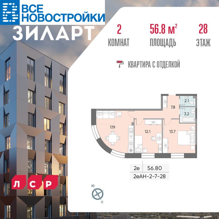 Продаётся 2-комнатная квартира в доме 18 (ЗИЛАРТ GRAND) ЖК «ЗИЛАРТ» общей площадью 56.8 кв. метров на 28 этаже.