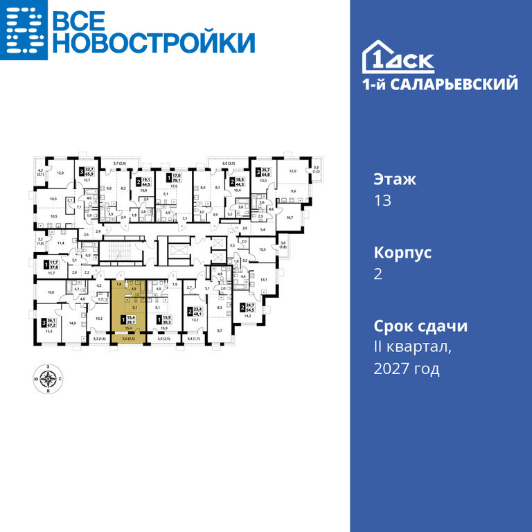Продаётся студия №124 общей площадью 29.7 кв.м. на 13-м этаже 25 этажного дома. Отделка Whitebox.