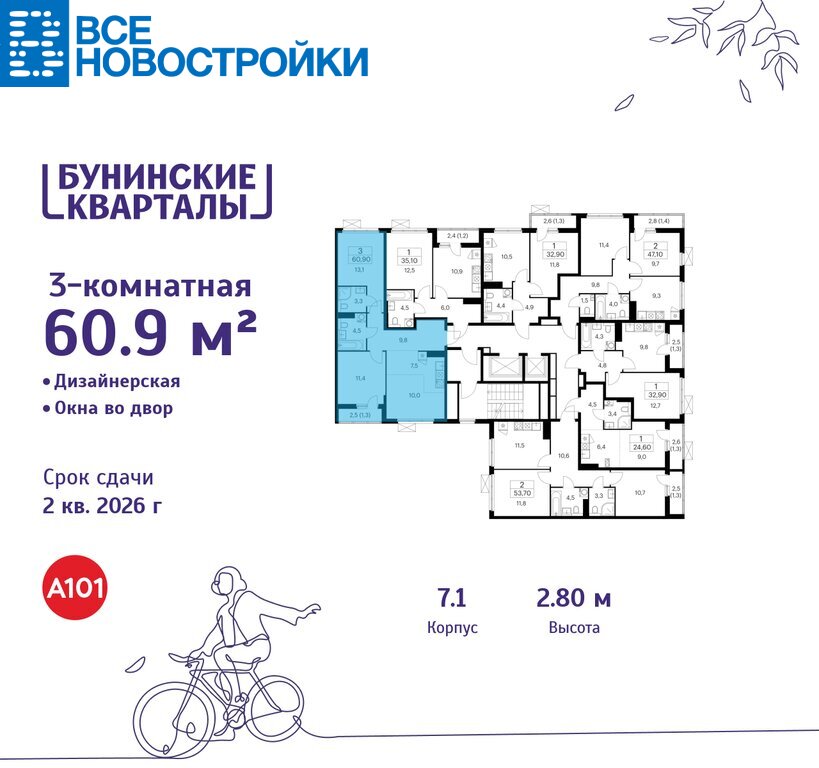 Продается трехкомнатная квартира № 105 в новостройке ЖК «Бунинские кварталы» по адресу Москва, ТиНАО, Новомосковский АО, Сосенское С/П, жилой комплекс Бунинские Кварталы, 7.1, район Коммунарка, Новомосковский административный округ, Москва. Общая площадь квартиры – 60.90 кв. м., этаж 10 из 17, секция 2. Тип проекта, по которому построен дом – монолит, компания-застройщик – ООО «А101». Стоимость квартиры – 14667887 Р. Срок сдачи – 2 квартал 2026.
