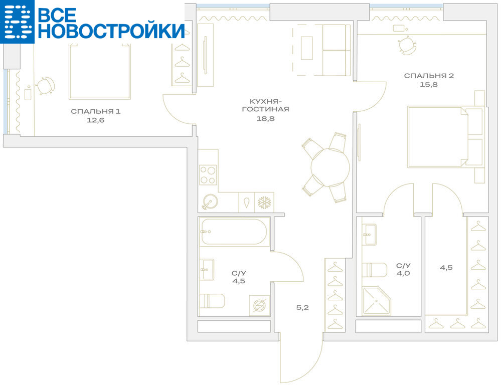 Продается 2-комнатная квартира общей площадью 65.4 кв. метров на 10 этаже комплекса бизнес-класса "Детали"