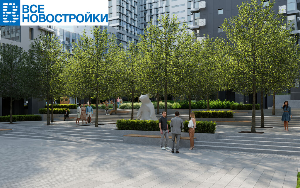 - На внутренней территории пространство с ландшафтным парком, детскими площадками, зонами для отдыха и арт-объектами.