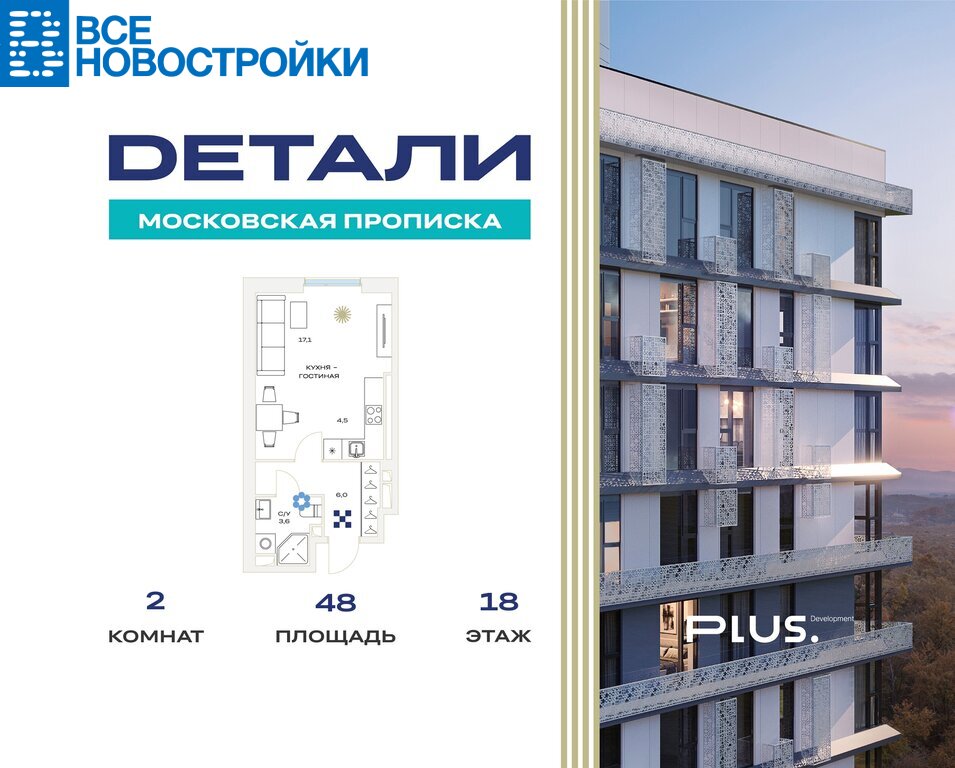 Продается 2-комнатная квартира общей площадью 48 кв. метров на 18 этаже комплекса бизнес-класса "Детали"
