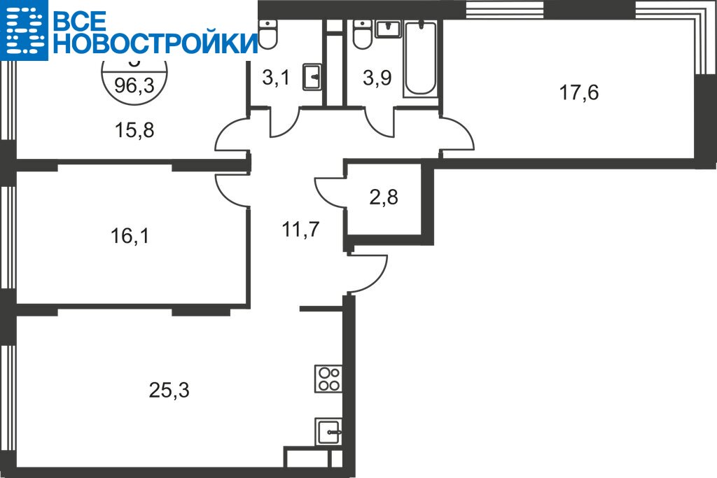 Общая площадь квартиры - 96,3 кв. м, этаж 13 из 17.