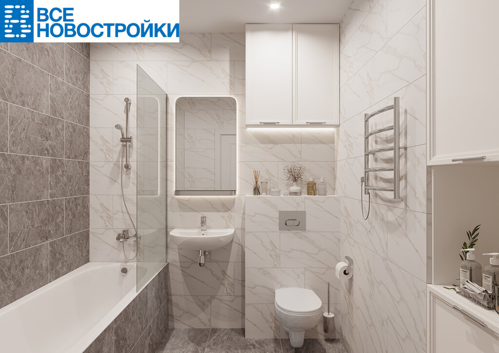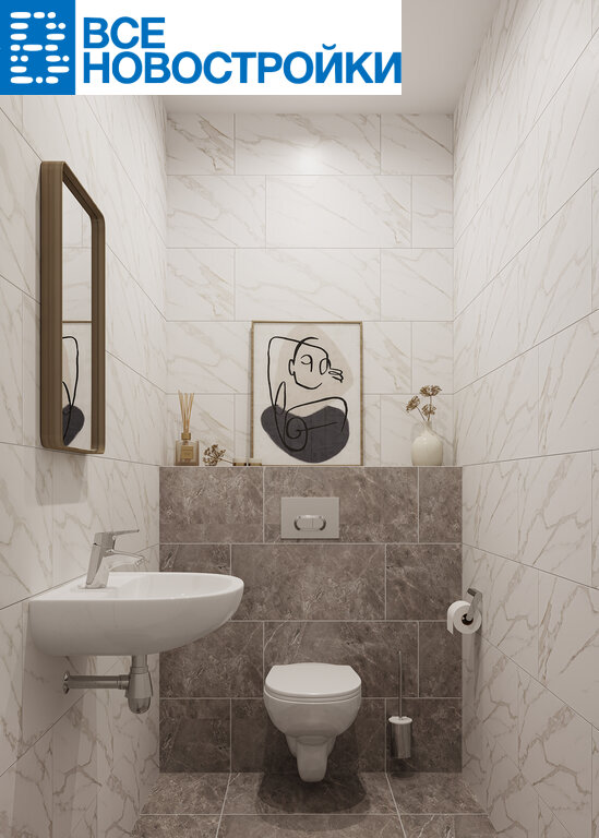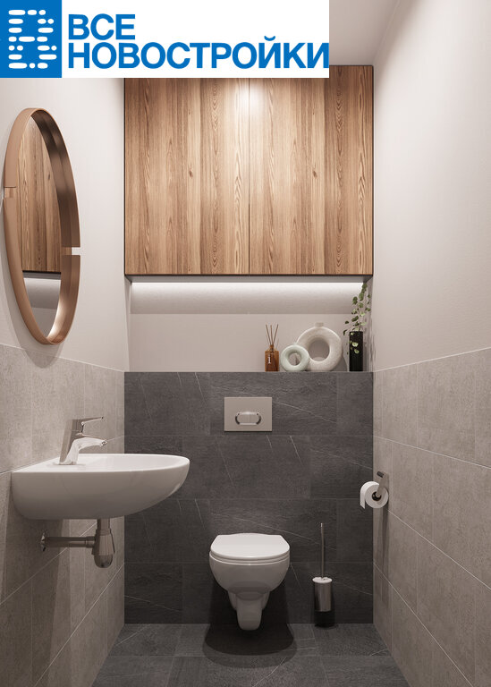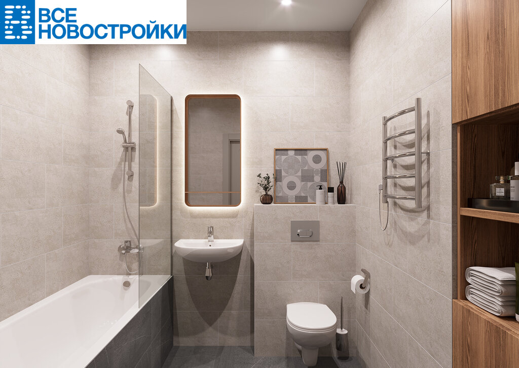 - Smart+ (современный стиль) – нейтральная цветовая гамма с использованием бетонных фактур и темного керамогранита, керамическая плитка до потолка в ванной и санузле.