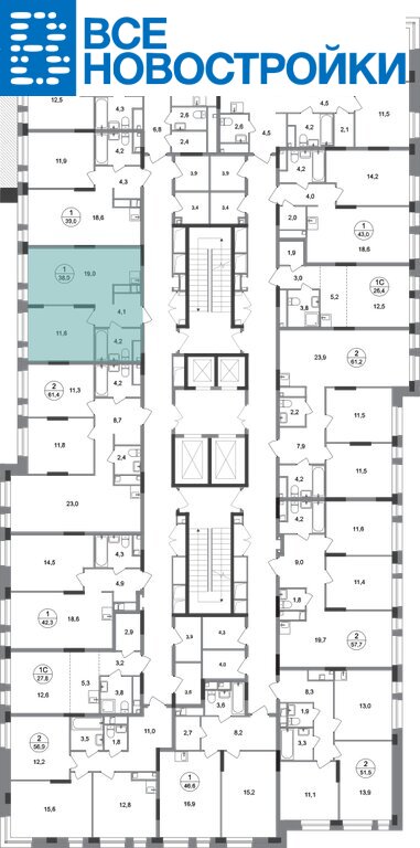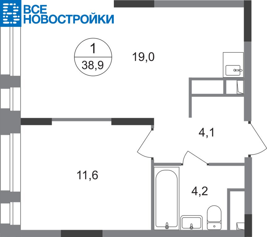 Общая площадь квартиры - 38,9 кв. м, этаж 2 из 19.
