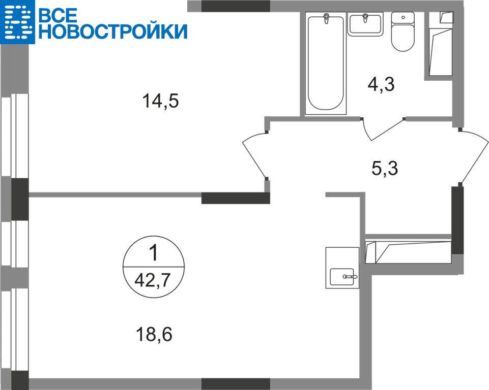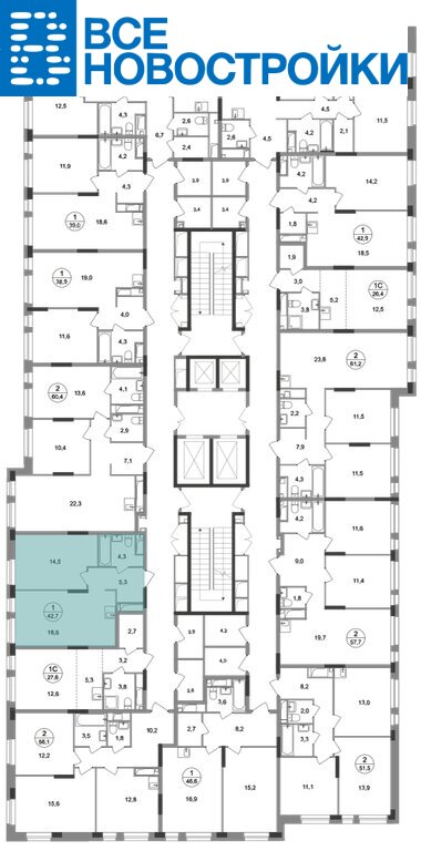 Общая площадь квартиры - 42,7 кв. м, этаж 10 из 19.