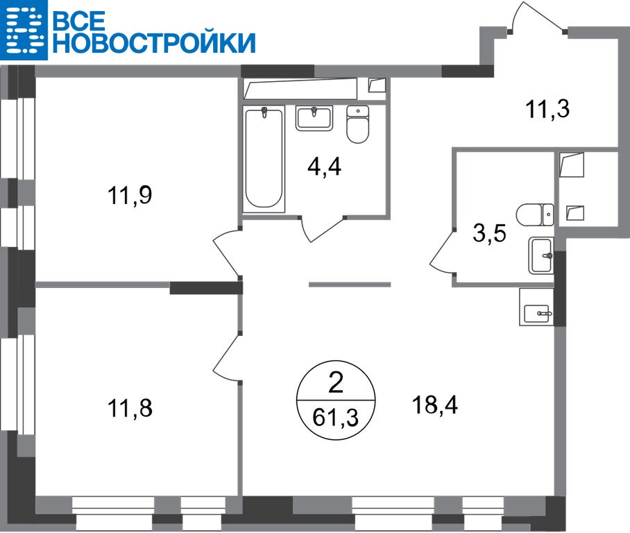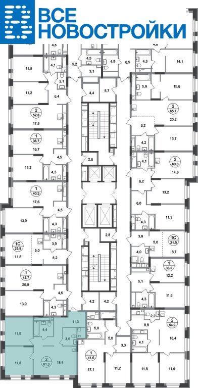 Общая площадь квартиры - 61,3 кв. м, этаж 17 из 20.