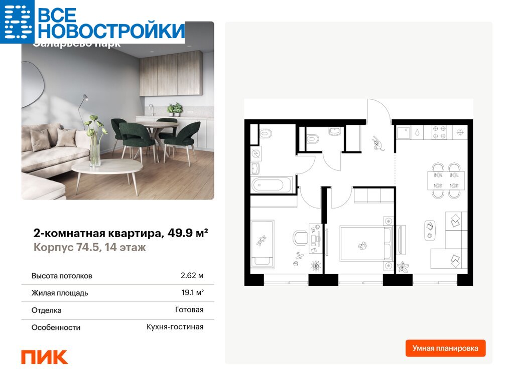 Продаётся 2-комн.квартира площадью 49.90 кв.м на 14 этаже 14 этажного дома (Корпус 74.5, секция 5) проекта ПИК Саларьево парк. Светлый просторный подъезд на уровне земли, функциональная планировка, большие окна, с отделкой.