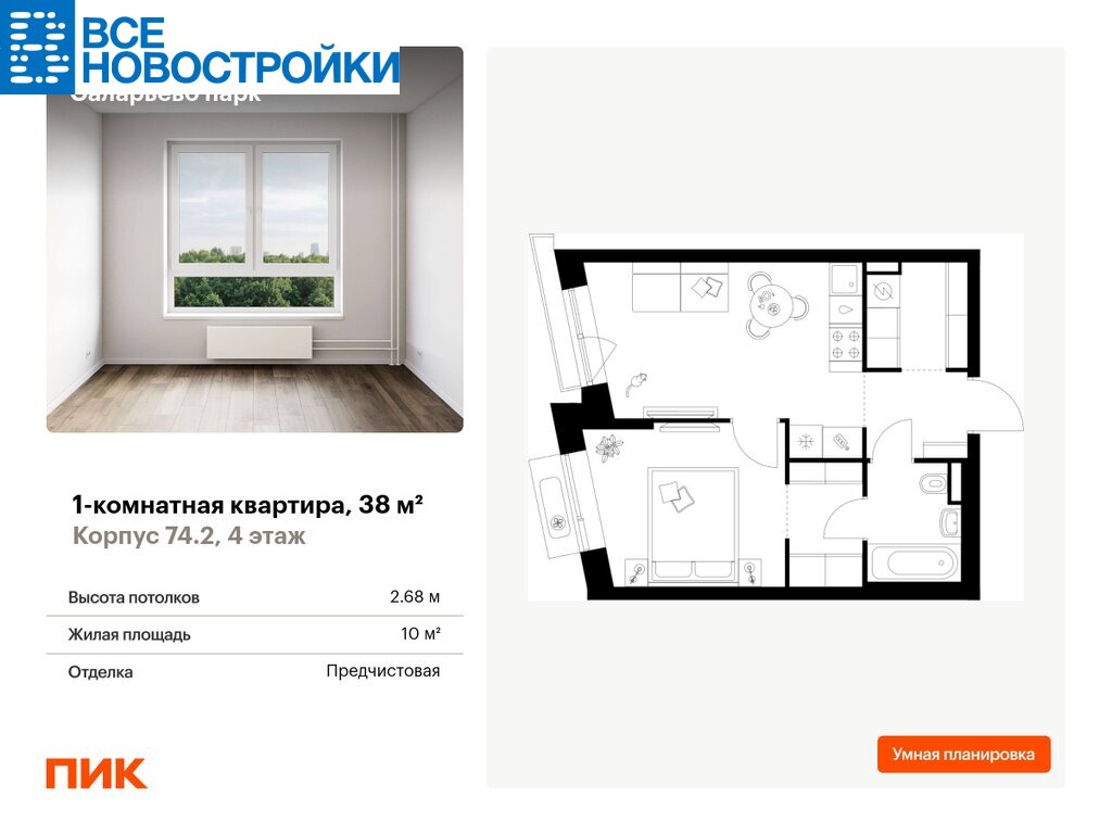 Продаётся 1-комн.квартира площадью 38.00 кв.м на 4 этаже 18 этажного дома (Корпус 74.2, секция 2) проекта ПИК Саларьево парк. Светлый просторный подъезд на уровне земли, функциональная планировка, большие окна, с отделкой.
