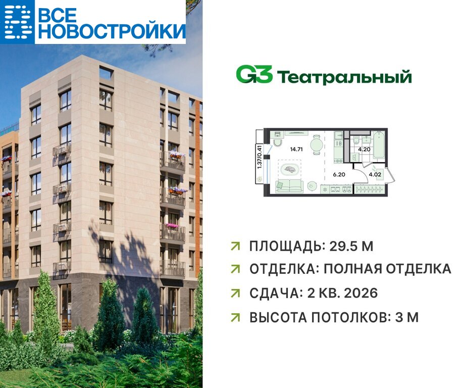 В современном квартале бизнес-класса G3 Театральный продаётся квартира-студия, общей площадью 29.54 кв.м, расположенная на 4 этаже (корпус 2, секция 1).