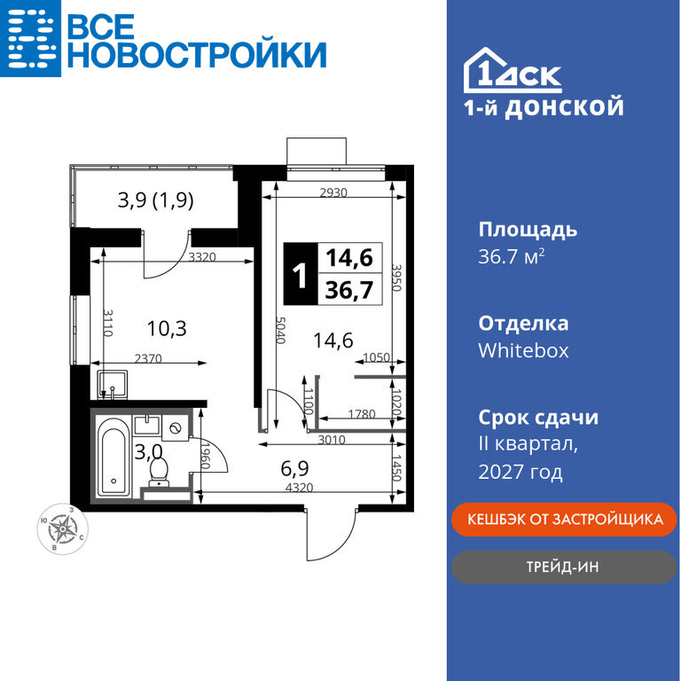 Продаётся 1-к квартира №102 общей площадью 36.7 кв.м. на 11-м этаже 24 этажного дома. Отделка Whitebox.