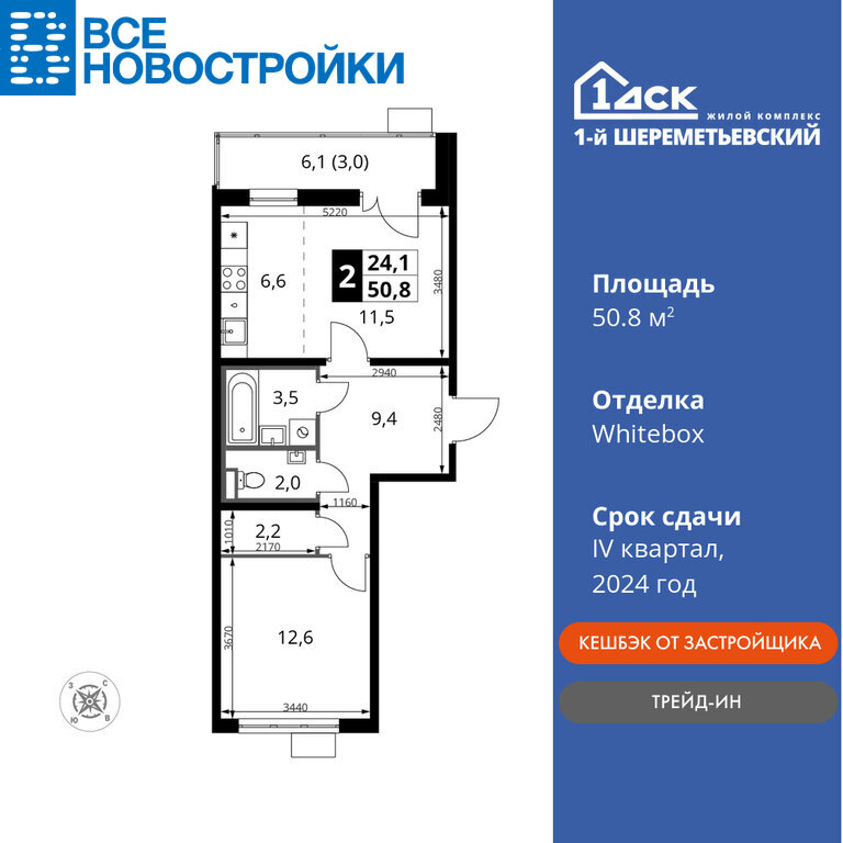 Продаётся 2-к квартира №165 общей площадью 50.8 кв.м. на 7-м этаже 16 этажного дома. Отделка Whitebox.