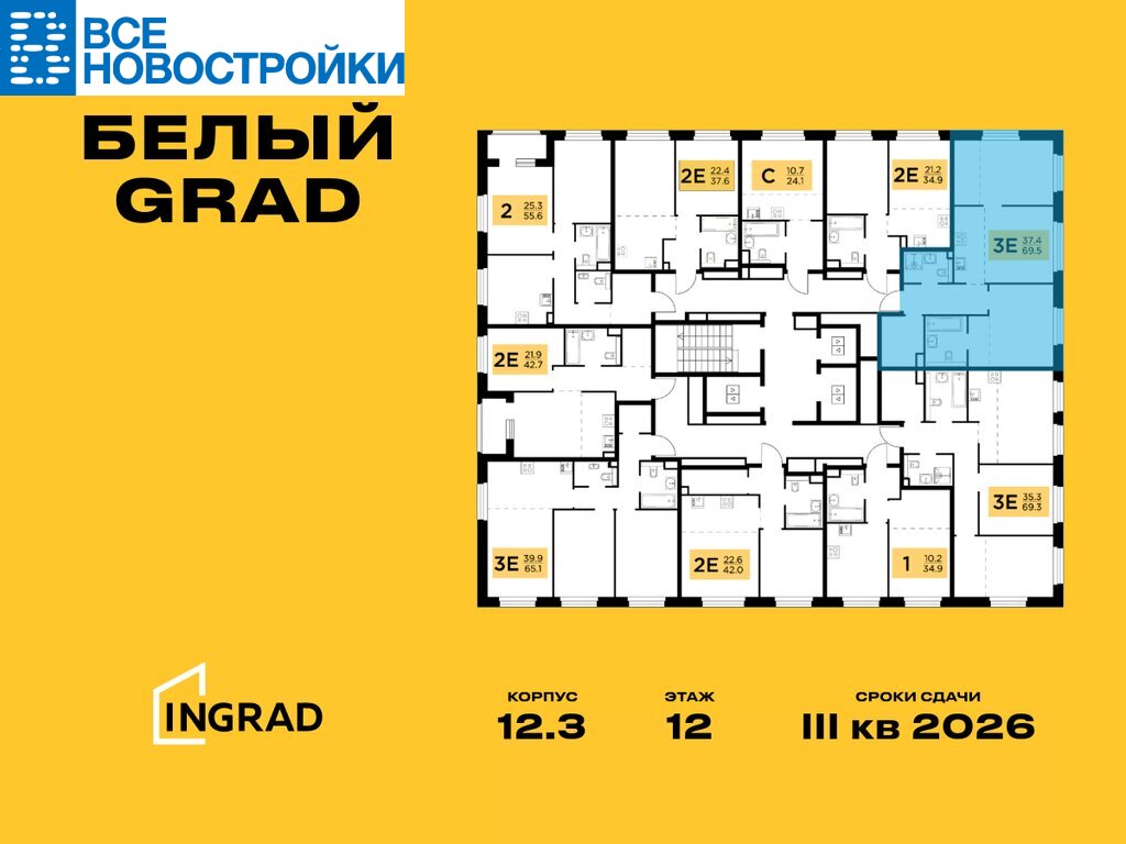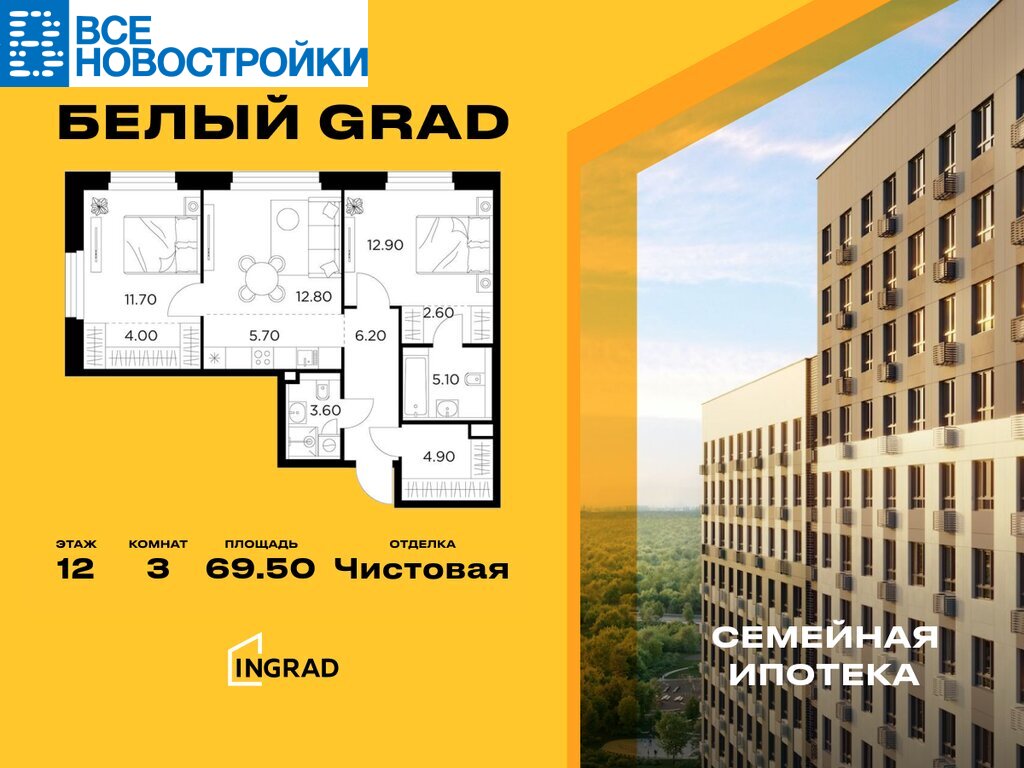Пряма продажа от застройщика. В жилом квартале комфорт-класса «Белый Grad» (застройщик ГК Инград) продаётся 3-комнатная квартира площадью 69.50 кв.м с с чистовой отделкой. Квартира расположена на 12 этаже 23-этажного дома, корпус 12.3.