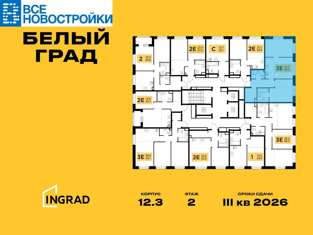 Пряма продажа от застройщика. В жилом квартале комфорт-класса «Белый Град» (застройщик ГК Инград) продаётся 3-комнатная квартира площадью 69.50 кв.м с с чистовой отделкой. Квартира расположена на 10 этаже 23-этажного дома, корпус 12.3.