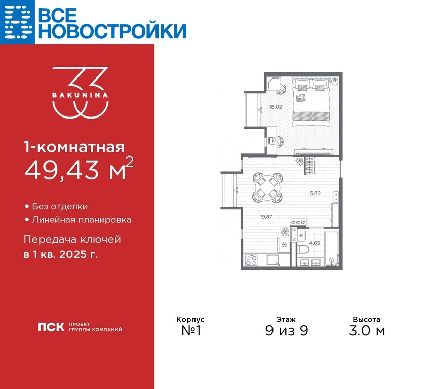 Apт.2268080. Просторная однокомнатная квартира в ЖК "BAKUNINA 33" на 9 этаже. Квартира без отделки, новый владелец может сделать ремонт по своему проекту. Общая площадь: 49.43 кв.м., жилая: 18.02 кв.м., площадь просторной кухни-столовой: 19.87 кв.м. Все окна выходят на одну сторону. В квартире два балкона, один совмещенный санузел. Высота потолков 3,5 м.