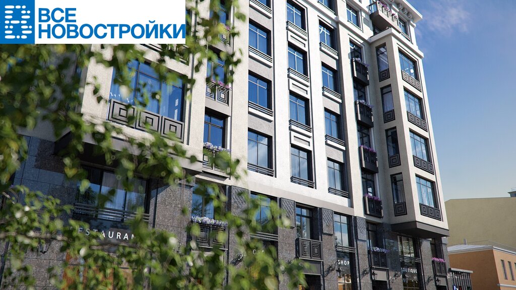 Фасады привлекают внимание плавными ритмичными переходами. Вертикальная разбивка колоннами визуально устремляет здание ввысь. Плоскость фасадов декорирована разными элементами из гранита. Ограждение балконов, эркеры и колонны дополнены лаконичным геометрическим орнаментом в акцентном теплом сером цвете.