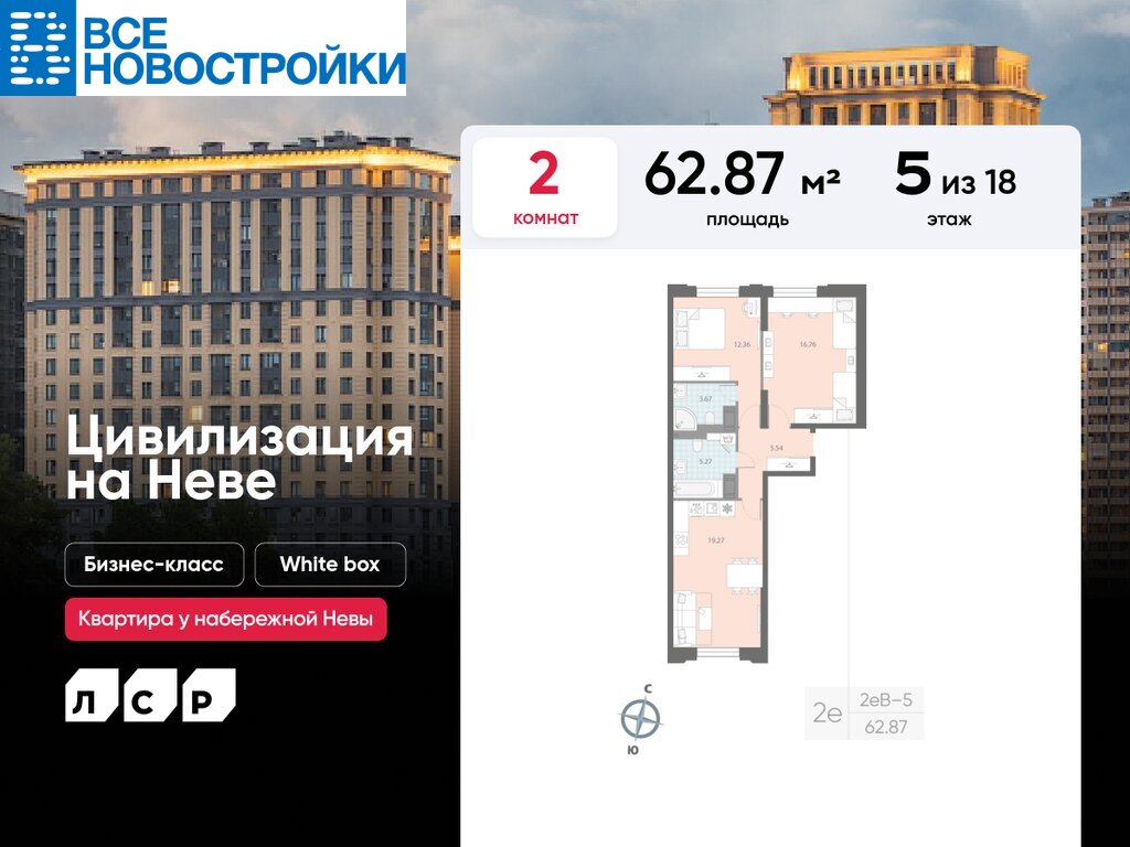 Продаётся 2-комнатная квартира в ЖК «Цивилизация на Неве» на 5 этаже. Общая площадь составляет 62.87 кв. м. Квартира с white box отделкой. Жилой комплекс «Цивилизация на Неве» располагается по адресу Санкт-Петербург, Невский.