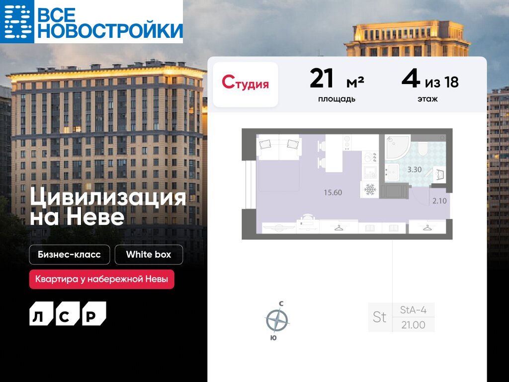 Продаётся студия в ЖК «Цивилизация на Неве» на 4 этаже. Общая площадь составляет 21.00 кв. м. Квартира с white box отделкой. Жилой комплекс «Цивилизация на Неве» располагается по адресу Санкт-Петербург, Невский.