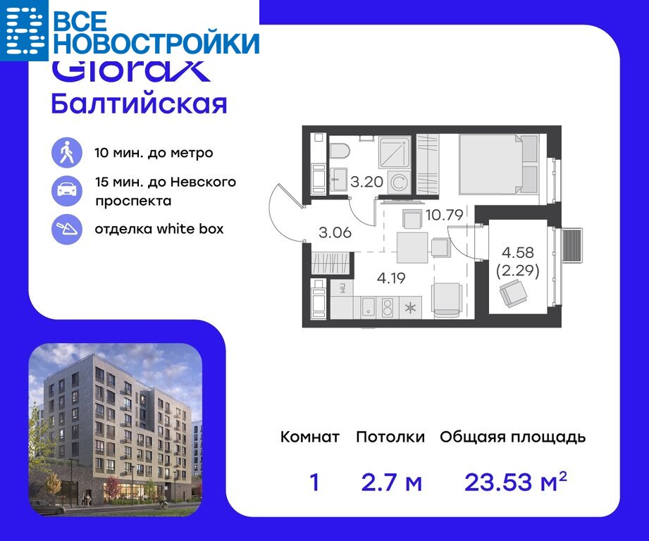 Продается 1-комнатная квартира на 9-м этаже в строящемся жилом комплексе бизнес-класса GloraX Балтийская. Общая площадь лота составляет 23,53 кв. м, из которых 10,79 кв. м отведено под жилую и 17,17 кв. м под кухонную зону.