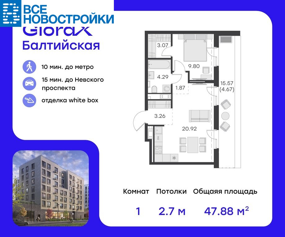 Продается 1-комнатная квартира на 8-м этаже в строящемся жилом комплексе бизнес-класса GloraX Балтийская. Общая площадь лота составляет 47,88 кв. м, из которых 9,80 кв. м отведено под жилую и 11,51 кв. м под кухонную зону.