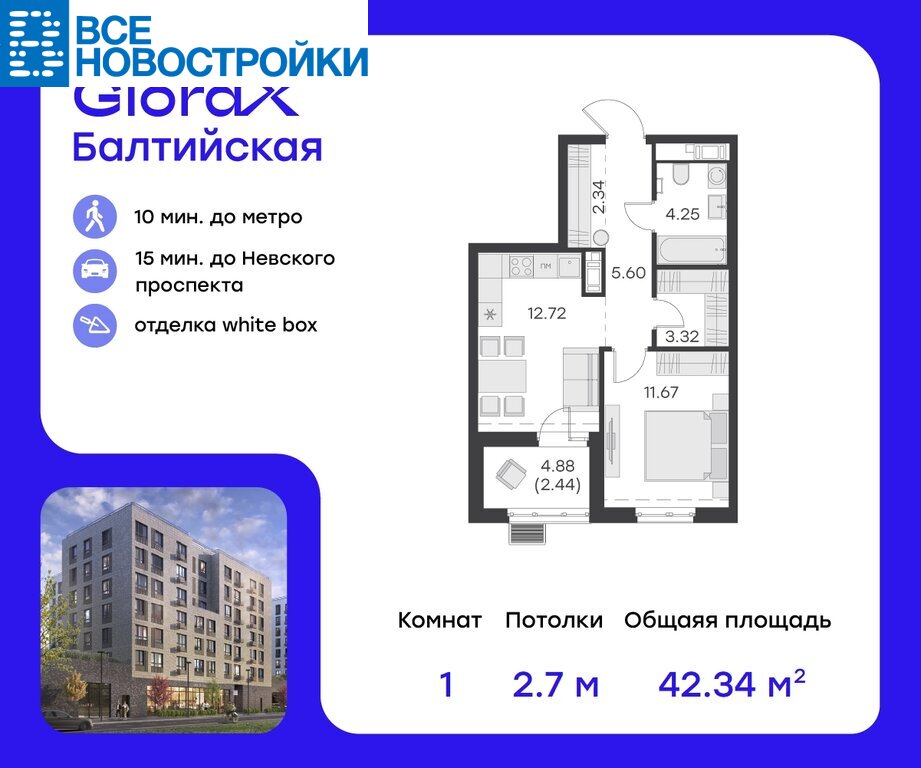 Продается 1-комнатная квартира на 7-м этаже в строящемся жилом комплексе бизнес-класса GloraX Балтийская. Общая площадь лота составляет 42,34 кв. м, из которых 11,67 кв. м отведено под жилую и 12,72 кв. м под кухонную зону.