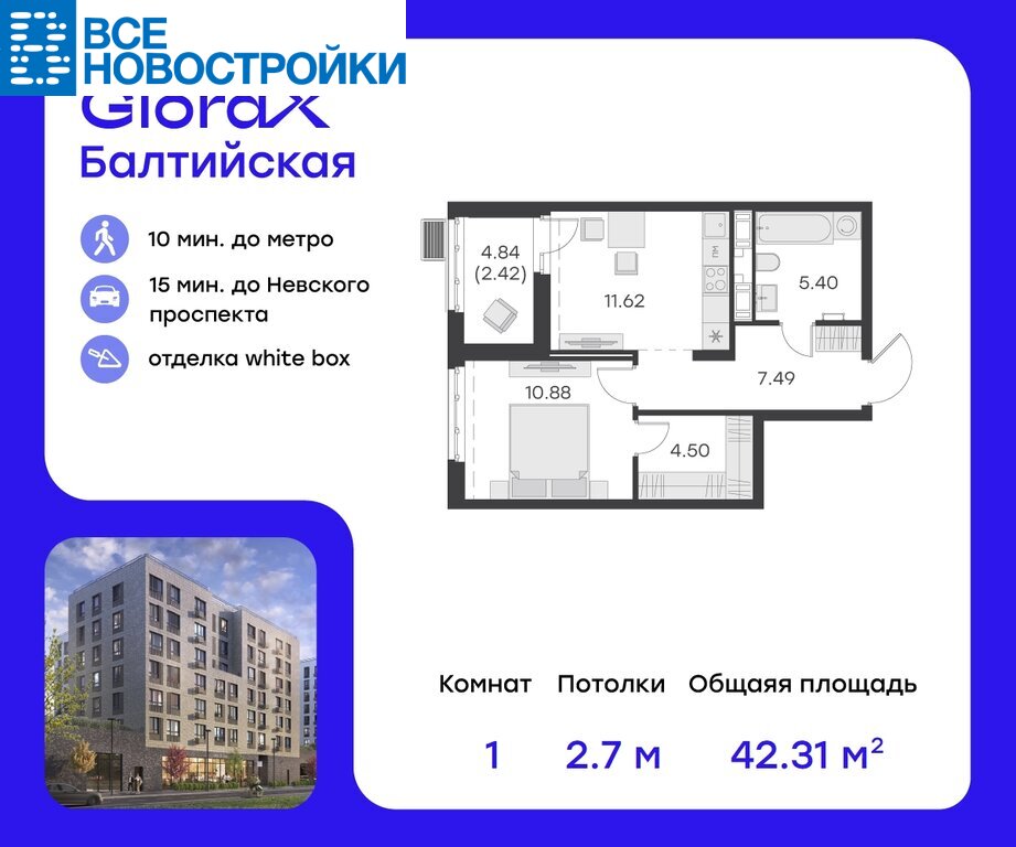 Продается 1-комнатная квартира на 7-м этаже в строящемся жилом комплексе бизнес-класса GloraX Балтийская. Общая площадь лота составляет 42,31 кв. м, из которых 10,88 кв. м отведено под жилую и 11,62 кв. м под кухонную зону.