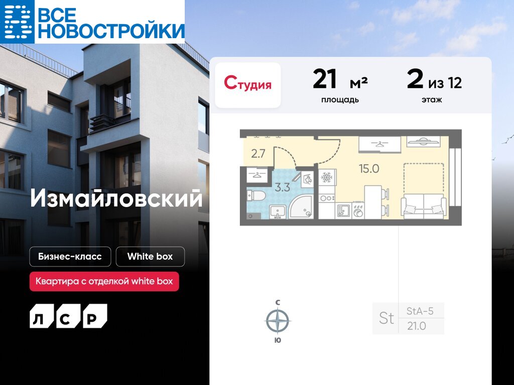 Продаётся студия в ЖК «Измайловский» на 2 этаже. Общая площадь составляет 21.00 кв. м. Квартира с white box отделкой. Жилой комплекс «Измайловский» располагается по адресу Санкт-Петербург, Адмиралтейский.