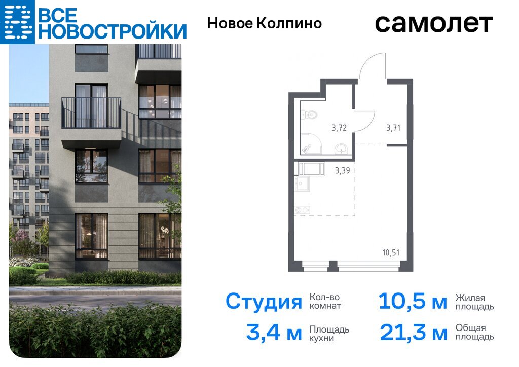Продается квартира-студия. Квартира расположена на 3 этаже 11 этажного монолитно-кирпичного дома (Корпус 33, Секция 4) в ЖК «Новое Колпино» от группы «Самолет».