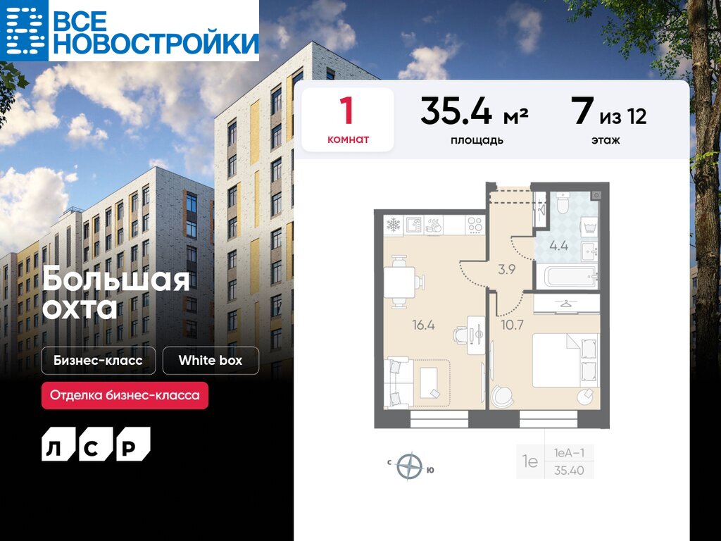 Продаётся 1-комнатная квартира в ЖК «Большая Охта» на 7 этаже. Общая площадь составляет 35.40 кв. м. Квартира с white box отделкой. Жилой комплекс «Большая Охта» располагается по адресу Санкт-Петербург, Красногвардейский.