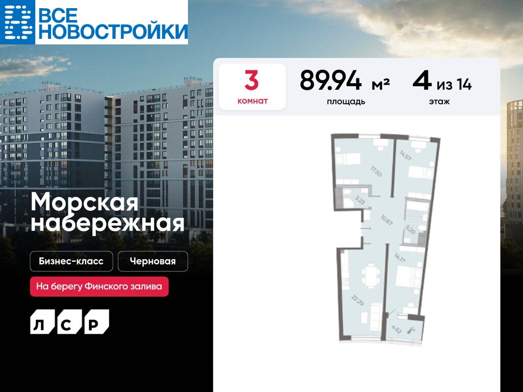 Продается 3-комнатная квартира в ЖК «Морская набережная» на 4 этаже. Общая площадь составляет 89.94 кв. м. Квартира без отделки. Жилой комплекс «Морская набережная» располагается по адресу Санкт-Петербург, Василеостровский