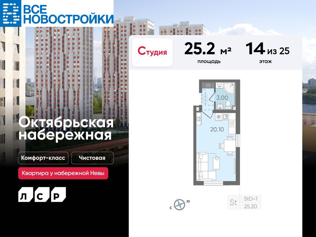 Продается студия в ЖК «Октябрьская набережная» на 14 этаже. Общая площадь составляет 25.20 кв. м. Квартира с чистовой отделкой . Жилой комплекс «Октябрьская набережная» располагается по адресу Санкт-Петербург, Невский.