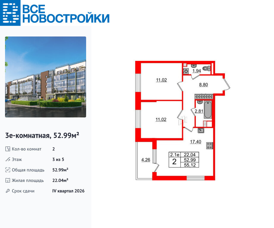 Удобная, классическая, функциональная европланировка, большая кухня-гостиная 17.4 м², вместительная прихожая 8.8 м². Общая площадь квартиры - 52.99 м², жилая – 22.04 м², высота потолка 2.77 м.
