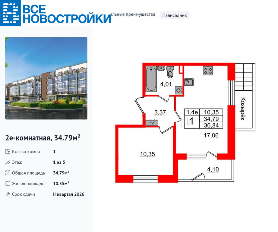 Удобная, классическая, функциональная европланировка, большая кухня-гостиная 17.06 м², вместительная прихожая 3.37 м². Общая площадь квартиры - 34.79 м², жилая – 10.35 м², высота потолка 2.77 м.