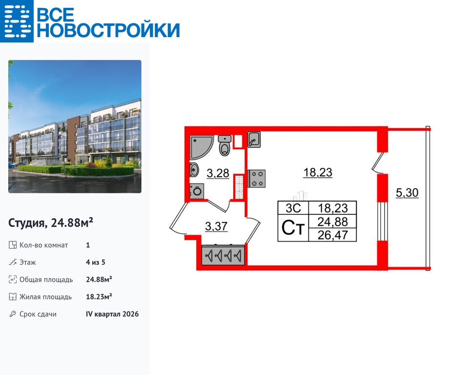 Удобная, классическая, функциональная европланировка, вместительная прихожая 3.37 м². Общая площадь студии - 24.88 м², жилая – 18.23 м², высота потолка 2.77 м.