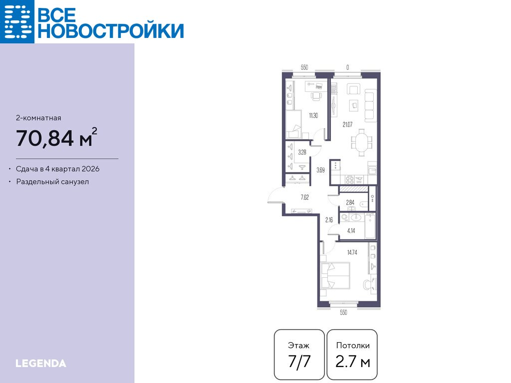 Квартира с двумя спальнями в комплексе "Сампсониевский 32" от LEGENDA на 7 этаже.