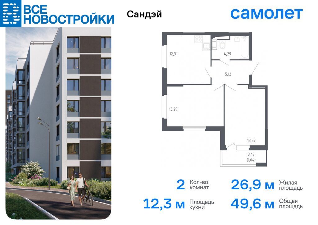 Предлагается 2-комнатная квартира комфорт-класса 49,62 кв.м в корпусе 7.2 на 5 этаже, в ЖК «Сандэй»