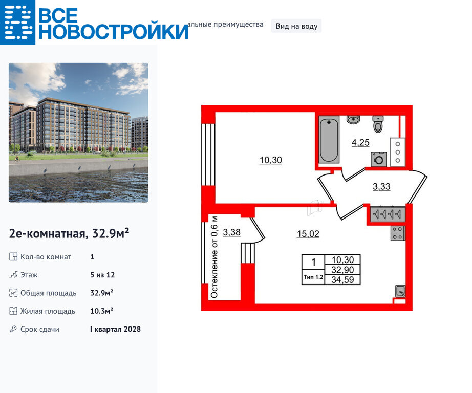 Удобная, классическая, функциональная европланировка, большая кухня-гостиная 15.02 м², вместительная прихожая 3.33 м². Общая площадь квартиры - 32.9 м², жилая – 10.3 м², высота потолка 2.77 м.