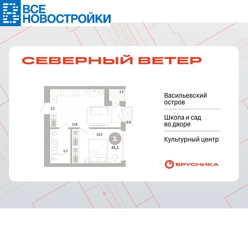 Просторная 1-комн. квартира с первичной отделкой в ЖК "Северный ветер" на 12 этаже. Общая площадь: 41.06 кв.м., жилая: 13.5 кв.м., площадь просторной кухни-столовой: 17.6 кв.м. Все окна выходят на одну сторону. В квартире один балкон и одна лоджия, один совмещенный санузел. Высота потолков 3.1 м.